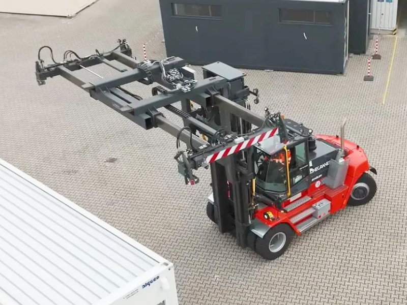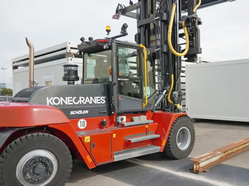 目前,Algeco拥有15辆科尼SMV12-1200叉车,这些可靠的设备具有箱式底盘和短轴距,具有出色的机动性,可以安全轻松地起升高达12吨的重物。每辆叉车都是为超大负载量身定制的,并配有定制吊具,可以处理各种集装箱和模块化建筑材料。高达9.8米的门架,可堆叠三个集装箱。